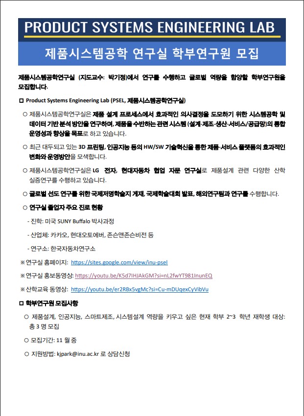 제품시스템공학 연구실 학부연구원 모집
