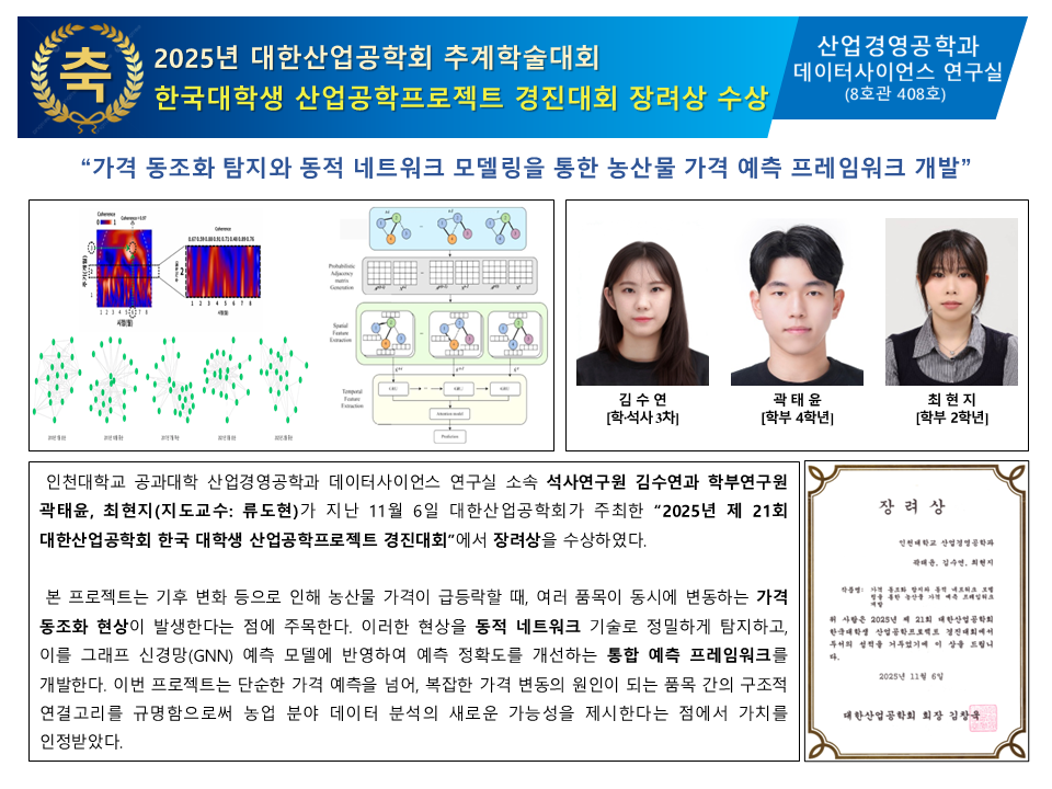 2025년 대한산업공학회 제 21회 한국대학생 산업공학프로젝트 경진대회 장려상 수상