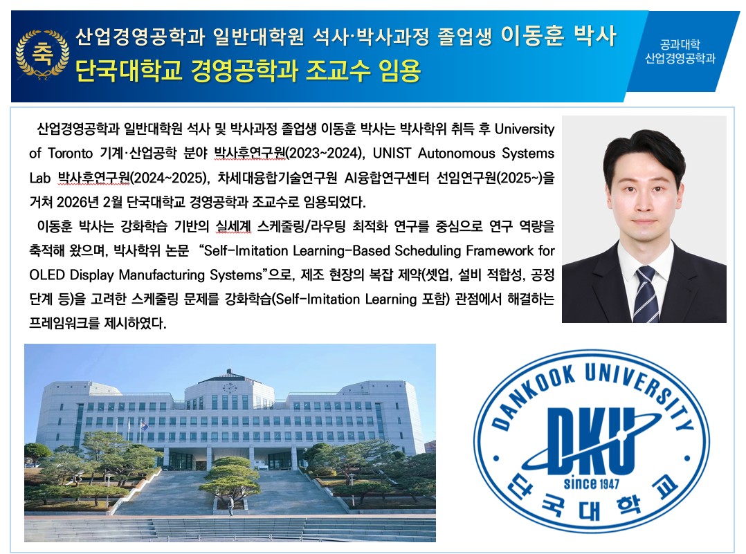 산업경영공학과 일반대학원 석사 ∙ 박사과정 졸업생 이동훈 박사_ 단국대학교 경영공학과 조교수 임용