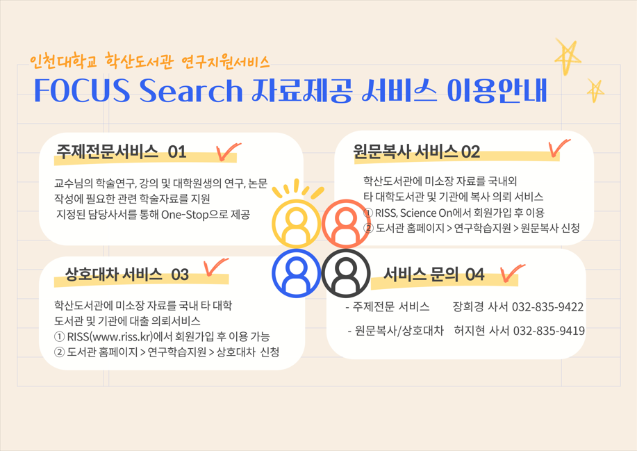 FOCUS Search 맞춤형 자료제공 서비스 (주제전문, 원문복사, 상호대차)를 운영하고 있습니다.