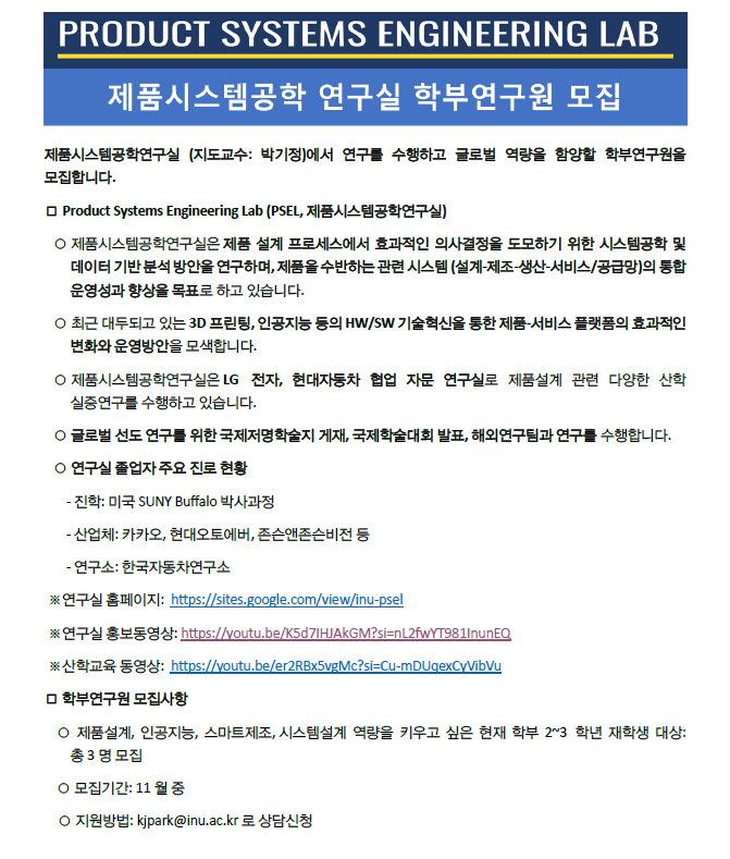 fnctId=bbs,fnctNo=352 제품시스템공학 연구실 학부연구원 모집 글번호 415119 작성일 2025-11-17 수정일 2025-11-17 작성자 산업경영공학과 (032-835-8926(학부), 8480(대학원)) 조회수 538 첨부파일 제품시스템공학연구실_학부연구원모집Flyer(251114).pdf 다음글 [대학혁신] 2025 대학혁신지원사업 학생참여 수기공모전 참여 안내 황미숙 2025-11-19 18:14:57.0 이전글 2025 산업경영공학과 학술제 11.28(금) 09:00~16:30 김태형 2025-11-14 13:46:18.0 목록
